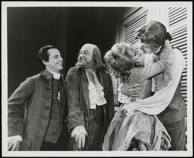 [Unidentified actor in the role of Thomas Jefferson, Howard Da Silva as Benjamin Franklin and William Daniels as John Adams in "1776".]
