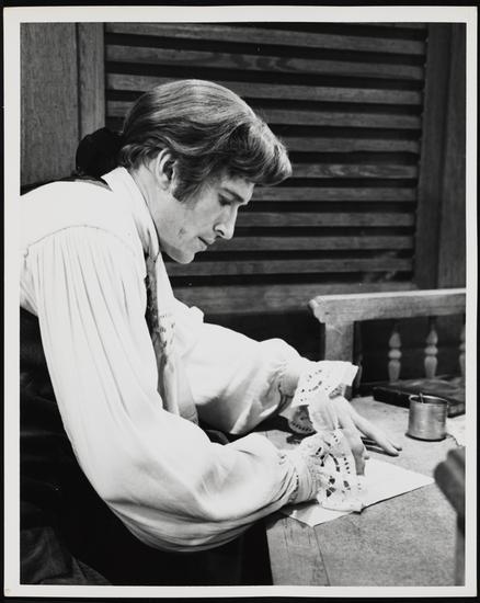 [Unidentified actor in the role of Thomas Jefferson, Howard Da Silva as Benjamin Franklin and William Daniels as John Adams in "1776".]