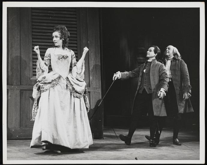 [Betty Buckley as Martha Jefferson, William Daniels as John Adams and Howard Da Silva as Benjamin Franklin in "1776".]