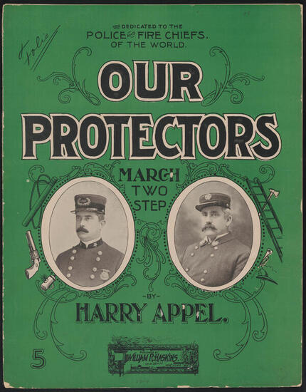 Chief Croker and aid Captain John Rush. [Two firemen in car.]