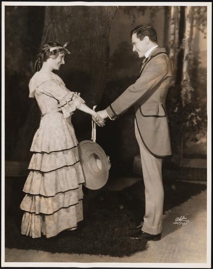 [William Gillette in the title role and Peg Entwistle as Alice Faulkner in "Sherlock Holmes".]