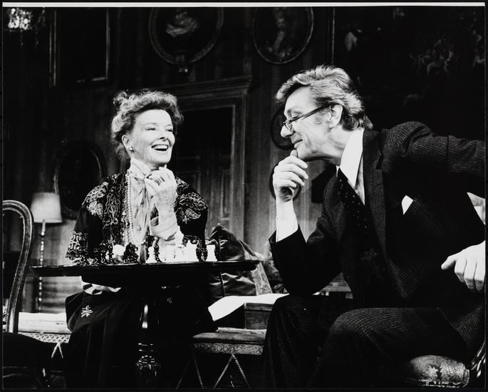 [Charlotte Jones as Dubois and Katharine Hepburn as Mrs. Basil in "A Matter of Gravity".]