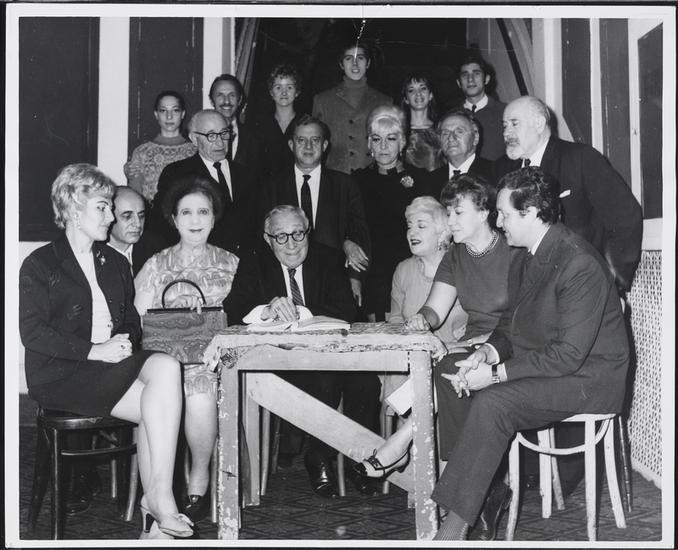 [Seymour Rexite and Molly Picon with a group of unidentified people.]