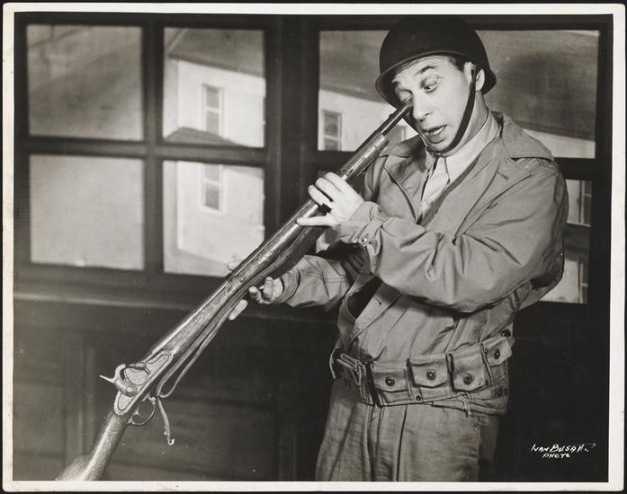 [Menasha Skulnik with a parachute.]
