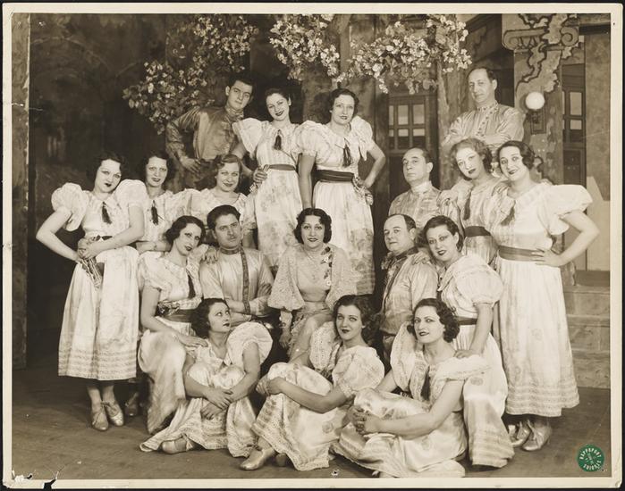 [Lillian Lux, Pesach Burstein, Baruch Blum, Gerri Ann Frank and other cast members in "My Mama the General".]