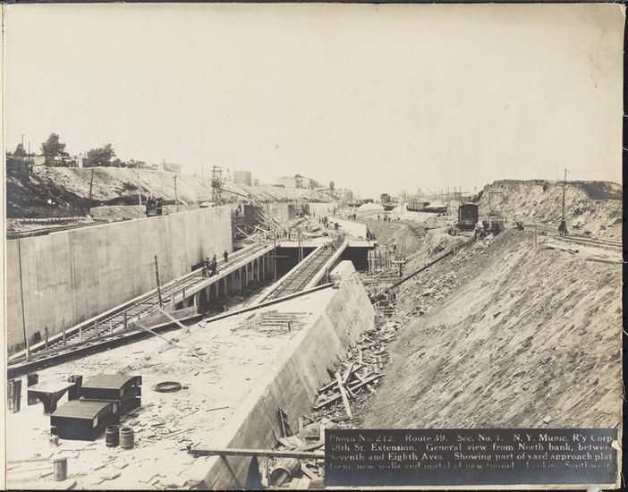 38th St. Extension. Steam Shovel Attacking Old North Retaining Wall Opposite 8th Ave. Looking North.