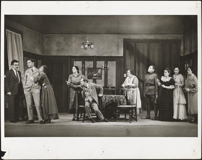 [Celia Adler, Leo Fuchs and Jacob Ben-Ami in "Life Marches On".]