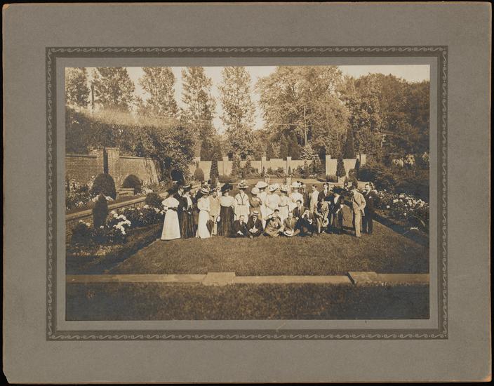 [Group in front of a house on James Speyer's estate.]