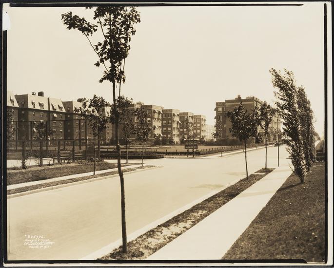 Tower Apartment complex. Exterior with tennis courts in foreground