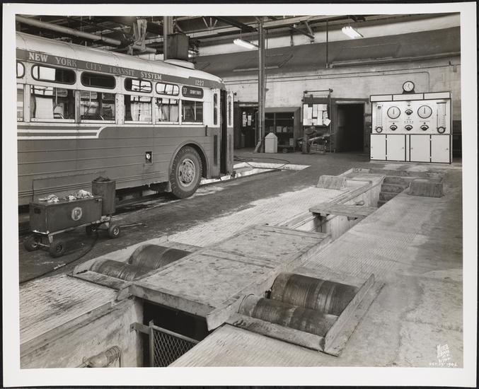 36th Street and Fifth Avenue. New York City Transportation Garage. Interior of bus one Otis proving stand