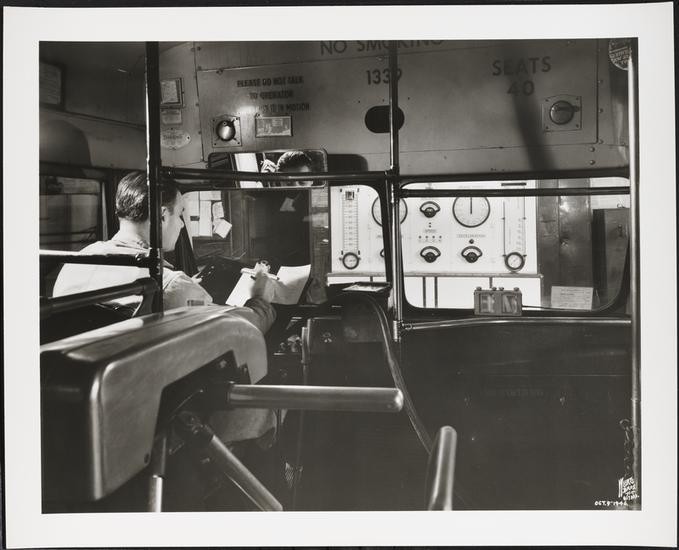 36th Street and Fifth Avenue. New York City Transportation Garage. Interior view of Otis proving stand with bus