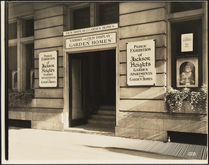 5th Avenue and 44th Street. Delmonico's, restaurant and showrooms. [Signs out front advertise exhibit of Jackson Heights apartments.]