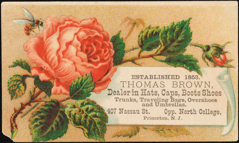 Thomas Brown, Dealer in Hats, Caps, Boots, Shoes, Trunks, Traveling Bags, Overshoes & Umbrellas