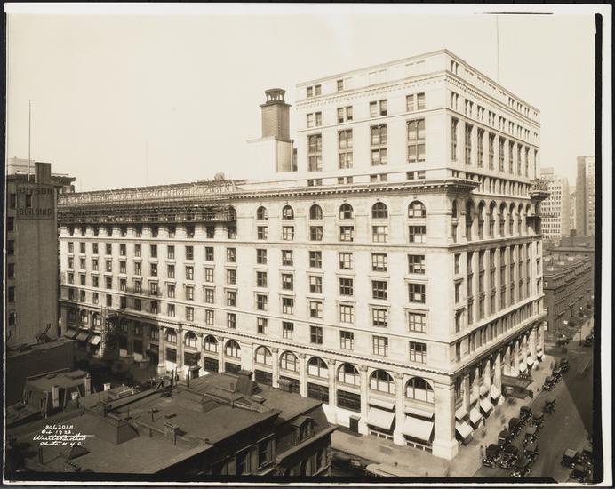 34th Street and Fifth Avenue. Altman's Department Store. Top floor scaffolding from elevated vantage