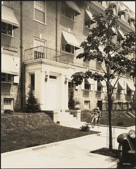 [Hawthorne Court. Apartment entrance and garden with children.]