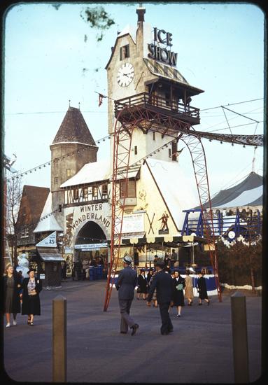 [The "Four Freedoms" and George Washington in front of the Trylon and Perisphere.]