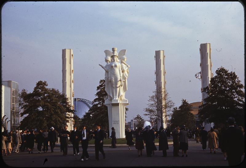 ["Four Freedoms" sculptures and a statue of George Washington in front of the Trylon and Perisphere.]