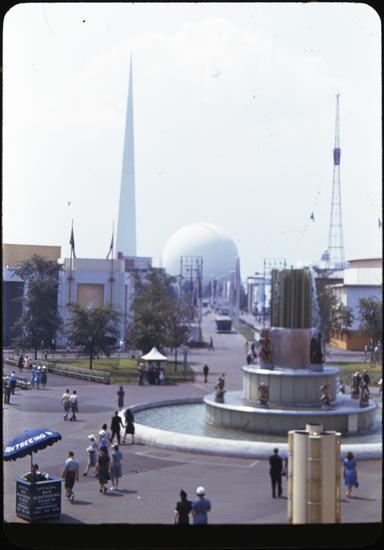 [Fountain in the Production and Distribution Zone looking toward the Trylon and Perisphere.]