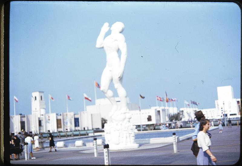 [The "Four Freedoms" and George Washington in front of the Trylon and Perisphere.]