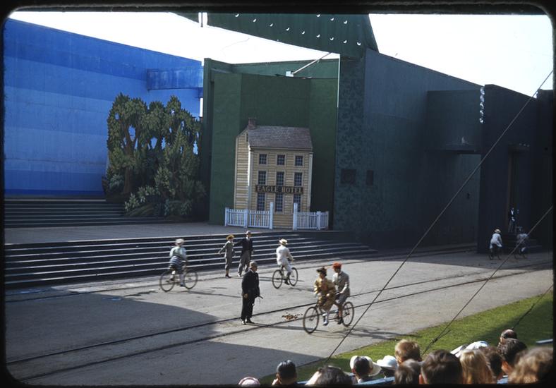 [Actors in period costumes by carriages in the Railroads on Parade show.]