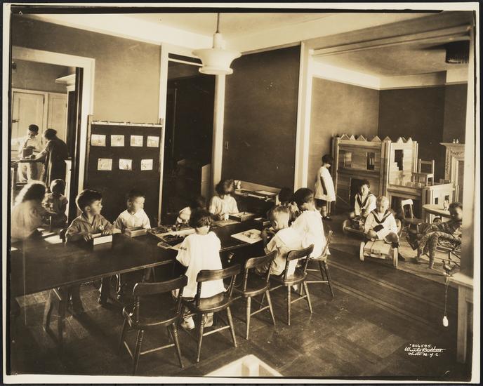 Interior view, private school, kindergarten classes, children at tables, woman standing along wall.