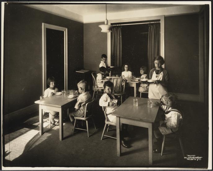Interior view, private school, kindergarten classes, children at tables, woman standing along wall.