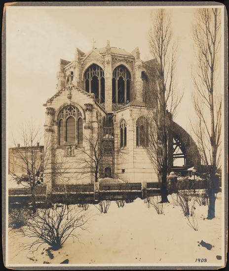 Amsterdam Avenue and 112th Street. Early Construction work on Cathedral of St. John the Divine. View of Arch.