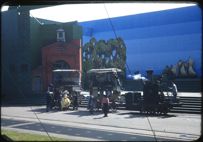 [Actors in period costumes by carriages in the Railroads on Parade show.]