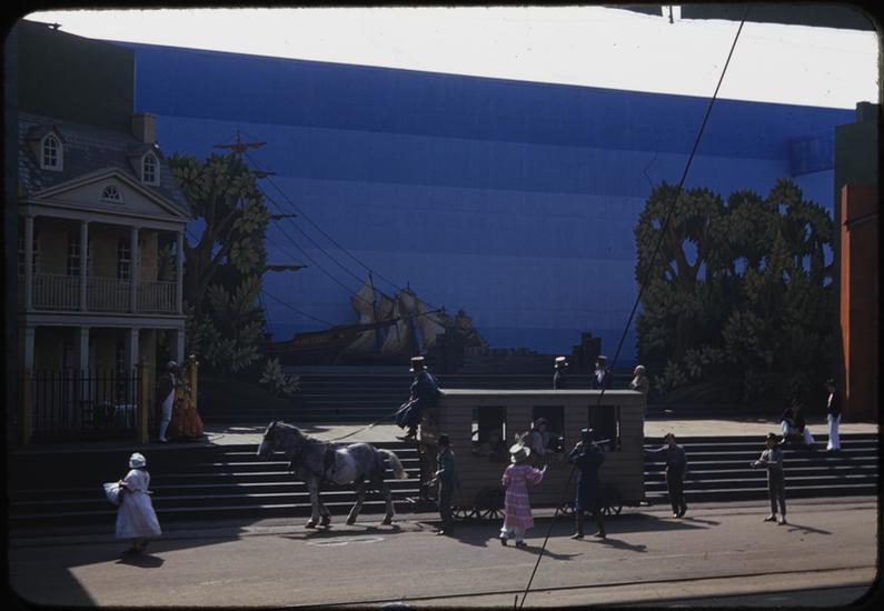 [Actors in period costumes by carriages in the Railroads on Parade show.]