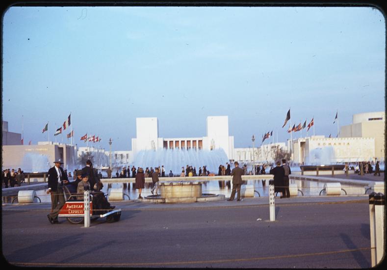 [British and Italian Pavilions through the Lagoon of Nations.]