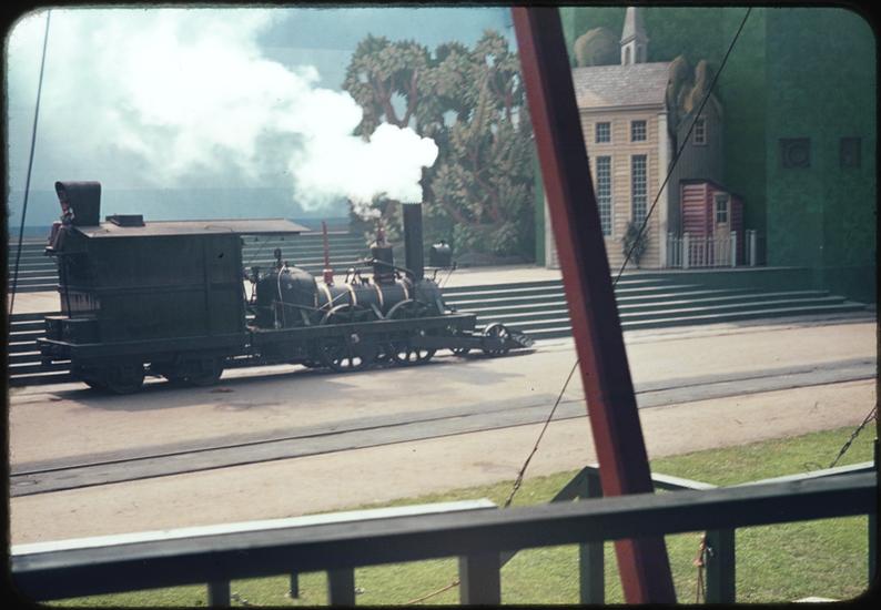 [Actors with a replica of the Jupiter locomotive during the Parade of Railroads show.]