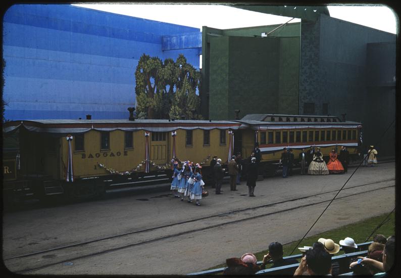 [Actors with a replica of the Jupiter locomotive during the Parade of Railroads show.]