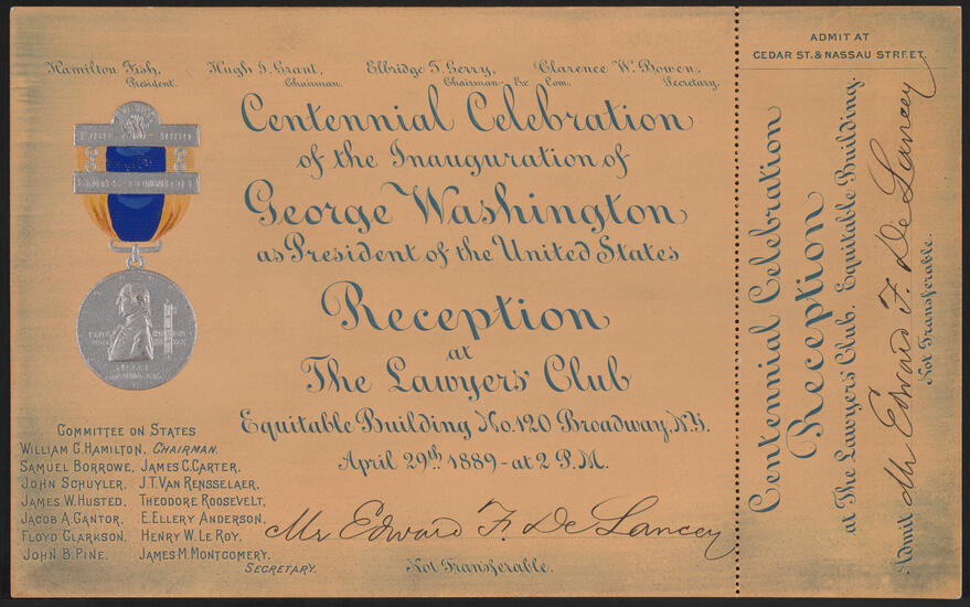 Invitation to Edward Floyd De Lancey for the centennial celebration of George Washington's presidential inauguration, April 29-30 and May 1, 1889