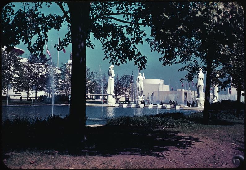 [The "Fountain of Atoms" and "American Womanhood" statue in front of the Home Furnishing Building.]