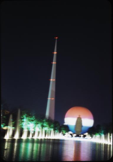 [Trylon and Perisphere at night.]