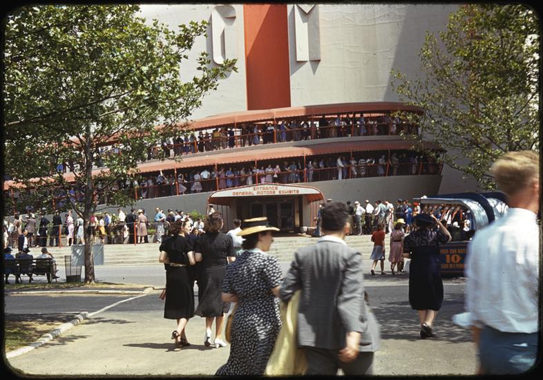 [General Motors building at New York World's Fair, with people waiting in line for the Futurama ride.]