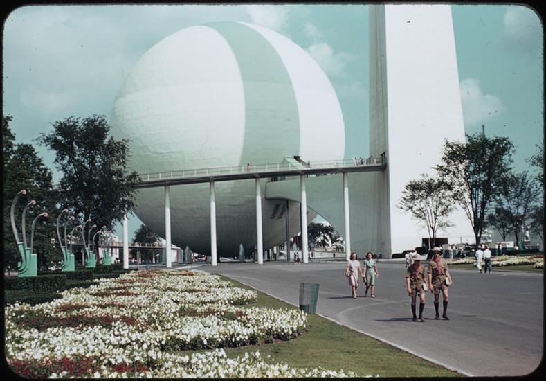 [Avenue of the Pioneers looking towards the Trylon and Perisphere.]