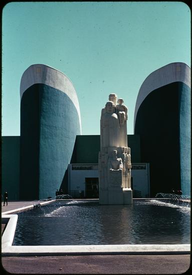 [The "Fountain of Atoms" and "American Womanhood" statue in front of the Home Furnishing Building.]
