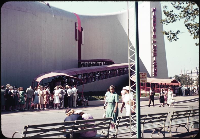 [People waiting in line for the Futurama ride at General Motors Highways and Horizons pavilion, New York World's Fair.]