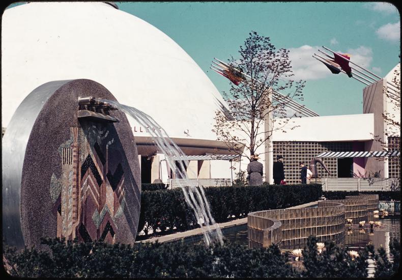 [Fountain in the Production and Distribution Zone looking toward the Trylon and Perisphere.]