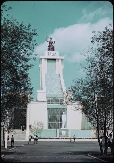 [British and Italian Pavilions through the Lagoon of Nations.]