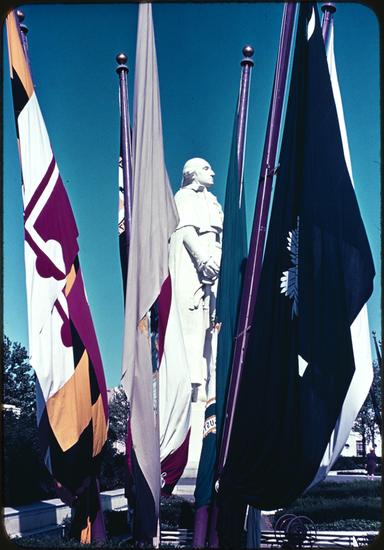 ["The Four Freedoms" and a statue of George Washington in front of the Trylon and Perisphere.]