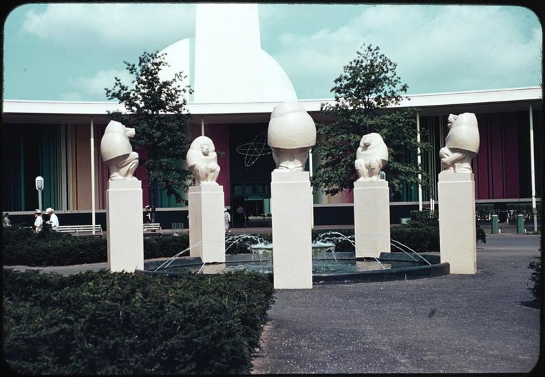[The "Fountain of Atoms" and "American Womanhood" statue in front of the Home Furnishing Building.]