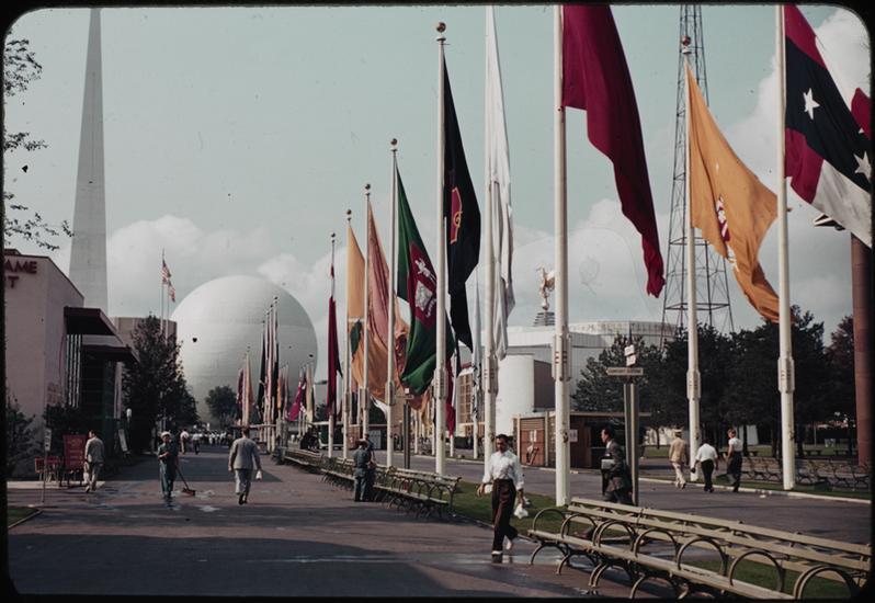 [Avenue of the Pioneers looking towards the Trylon and Perisphere.]