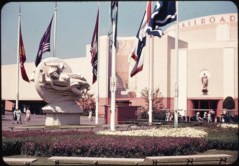 ["The Four Freedoms" and a statue of George Washington in front of the Trylon and Perisphere.]
