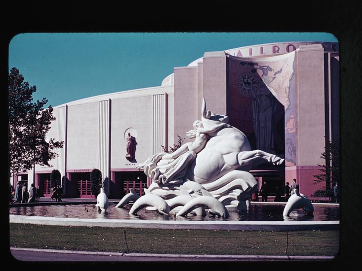[The "Fountain of Atoms" and "American Womanhood" statue in front of the Home Furnishing Building.]
