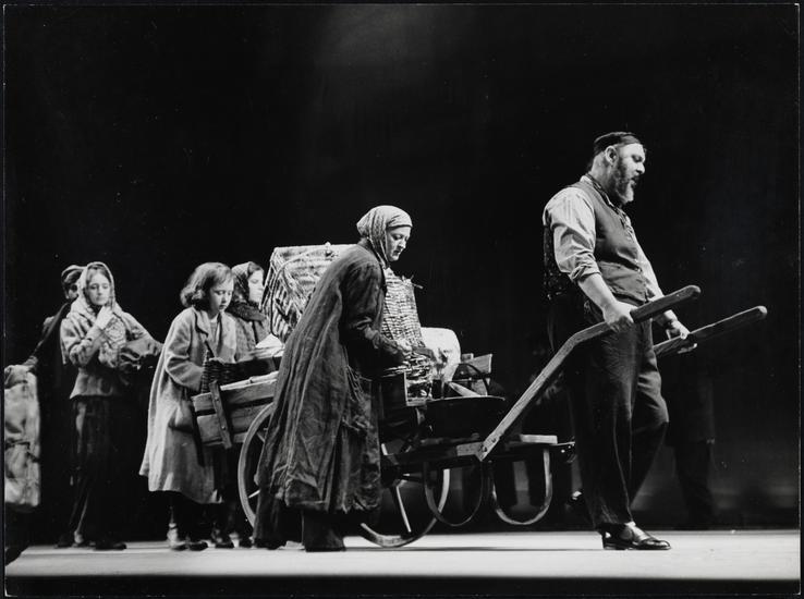 [Zero Mostel as Tevye, Julia Migenes as Hodel and Maria Karnilova as Golde in "Fiddler on the Roof".]