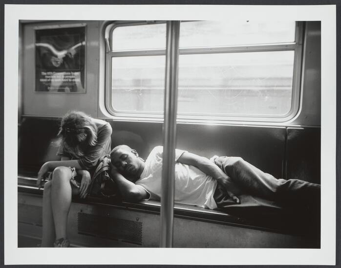 Young man asleep spread out on subway seat next to sleeping girl sitting curled forward.