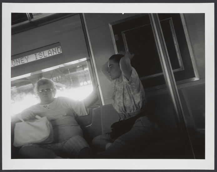 Slanted image of large older woman on train next to young woman wearing fanny pack pulling hair back.