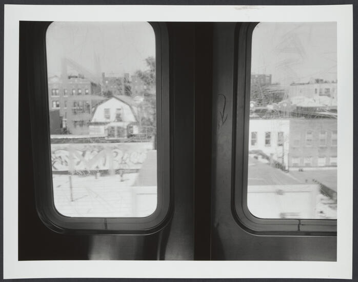 View out double windows of subway doors, building with barn-like roof visible out window on left.